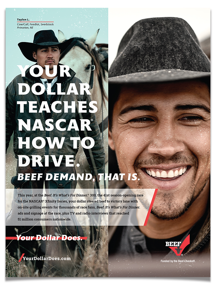 The Cattlemen’s Beef Board promotes the sale and consumption of beef globally. The program is funded by collecting $1 for every head of beef sold in the U.S. In an effort to educate producers on how their money is being used the Your Dollar Does campaign was developed. All ads feature real producers and educational statistics about the tangible benefits of the beef checkoff program.